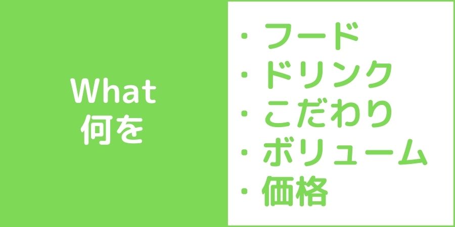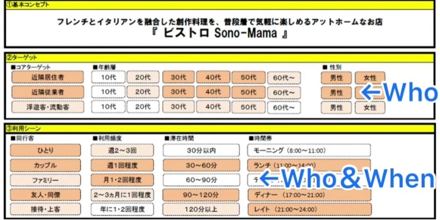 まず最初のWですね。「Who?」「誰に」というところですが、飲食店の場合、基本的に「誰に」というとお客さんになりますが、ただ単にお客さんということではなく、もう少し詳しく明確にする必要がありますね。